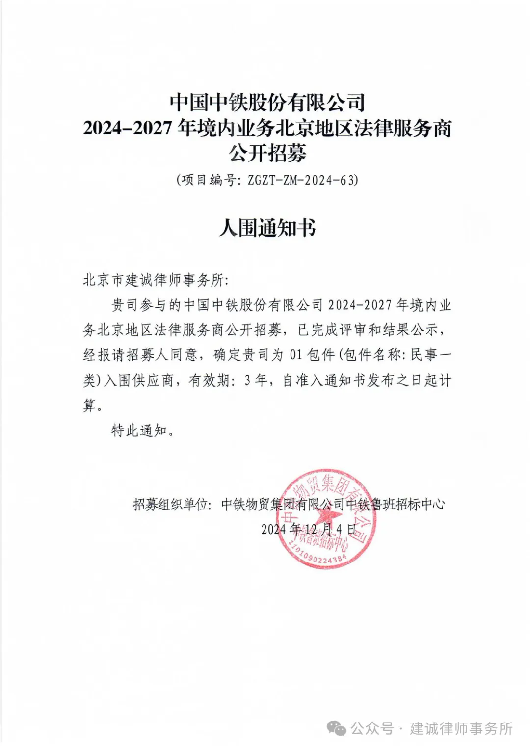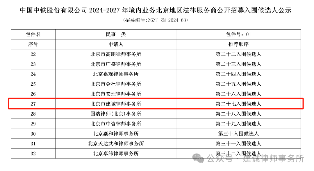 建诚所入围中国中铁法律服务商备选库